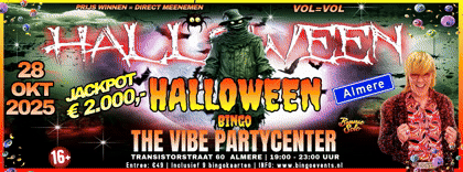 Speel mee met het grootste Halloween bingo-evenement van Almere. Op dinsdag 28 oktober verandert The Vibe Partycenter in een spookachtig bingo-paradijs, durf jij te komen?