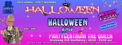 Speel mee met het grootste Halloween bingo-evenement van Hoofddorp. Op donderdagavond 30 oktober verandert Partycentrum The Queen in een spookachtig bingo-paradijs, durf jij te komen?